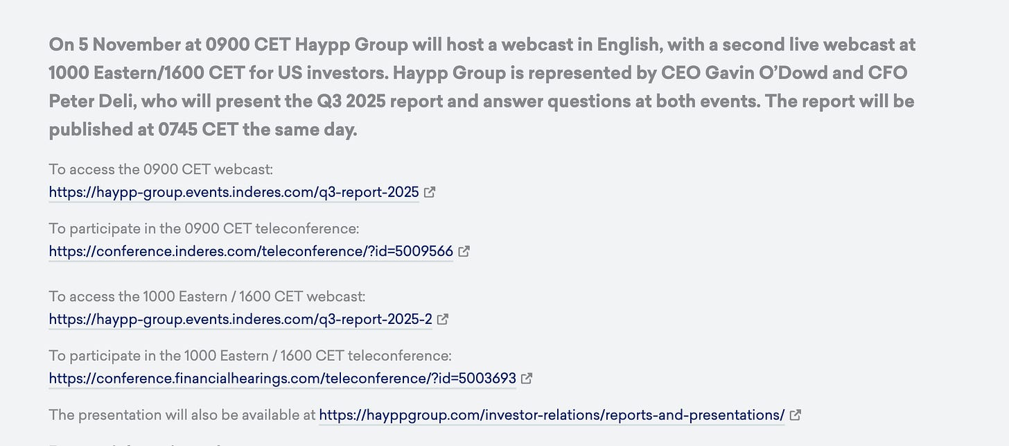 Haypp reports Q3 earnings next Wednesday, the 5th, and several key topics will be worth paying attention to. In my previous post, I already outlined some of the areas I’m watching, but here’s a more complete list of what would be particularly valuable to see discussed or clarified.