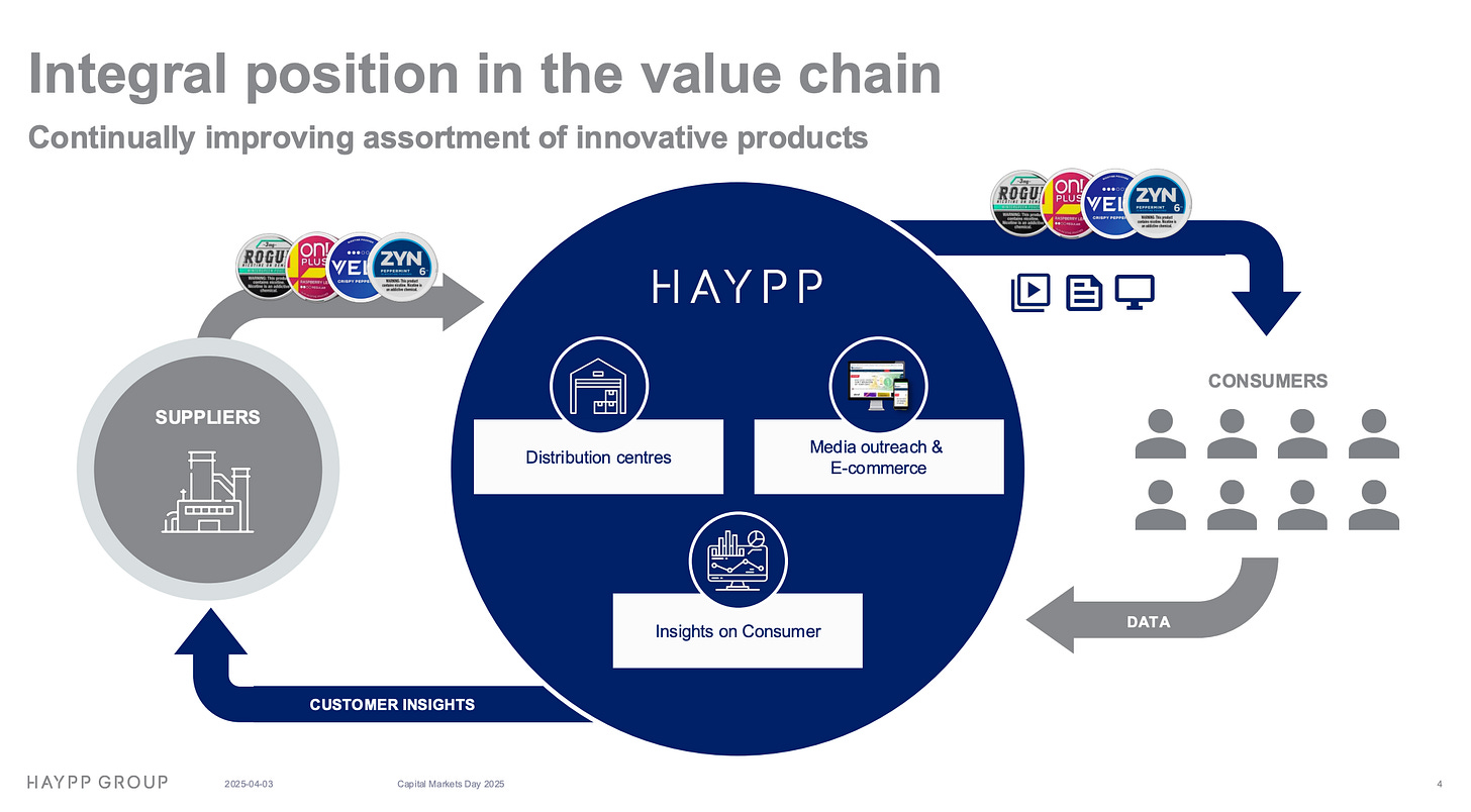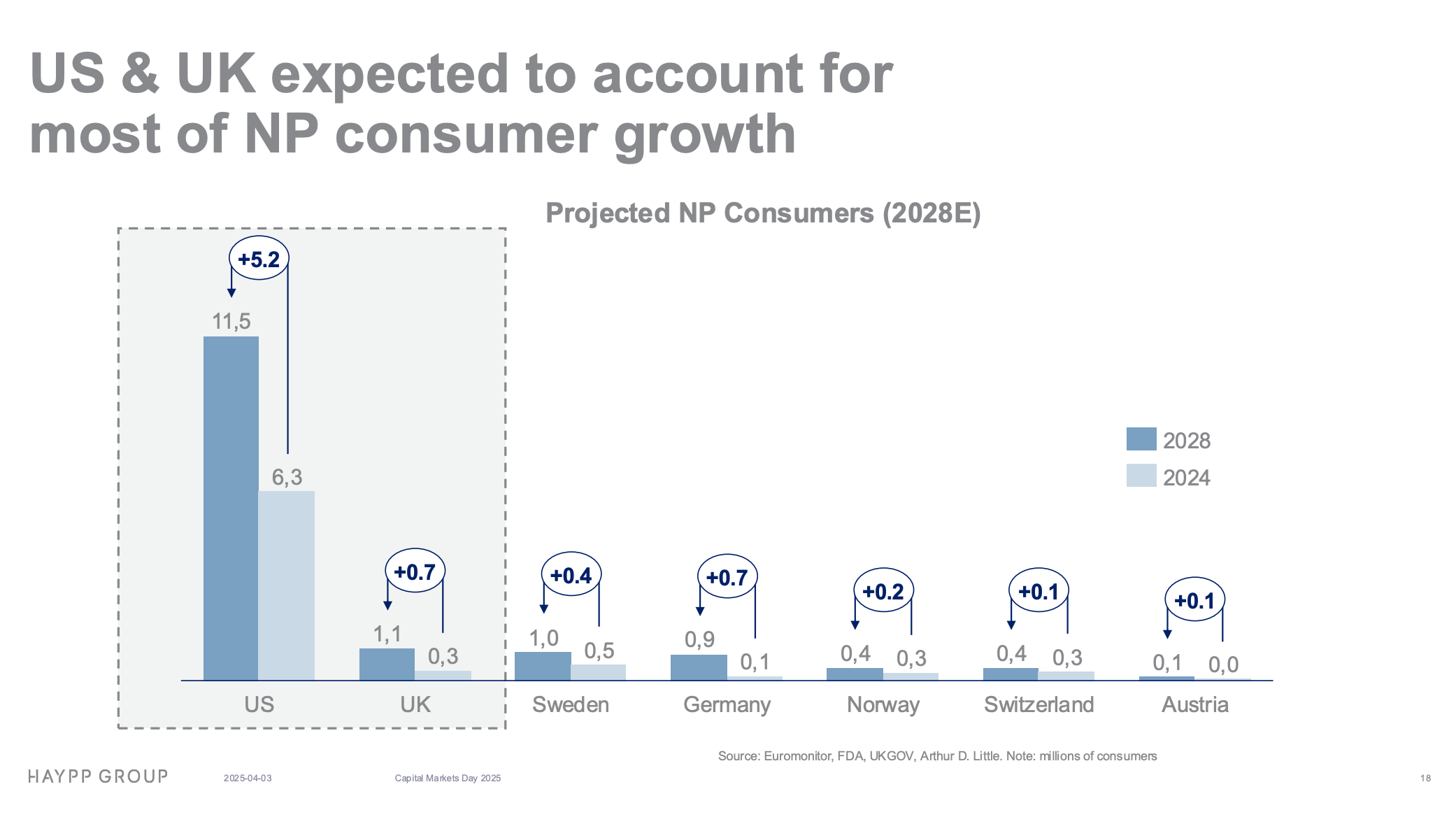 Haypp Group runs 16 e-commerce sites across 7 countries, selling nicotine pouches and snus. Total revenue is around SEK 4 billion, growing at an 18-25% CAGR target through 2028, with about 1,1 million active consumers.