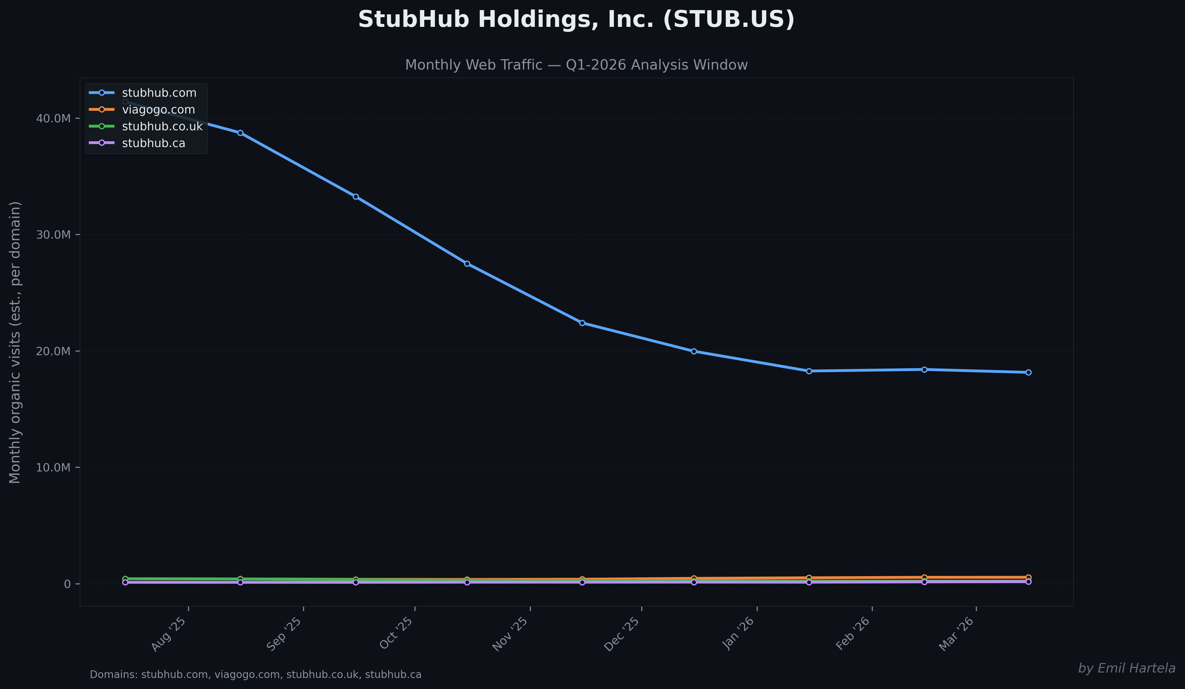 Aggregate web traffic dropped 16.5% quarter-over-quarter to 58.0 million visits in Q1 FY2026. The year-over-year decline hit 62.9%. North America drove most of the pullback; stubhub.com visits fell about 18% from 67.2 million to 55.2 million. Q1 is historically soft for live events.